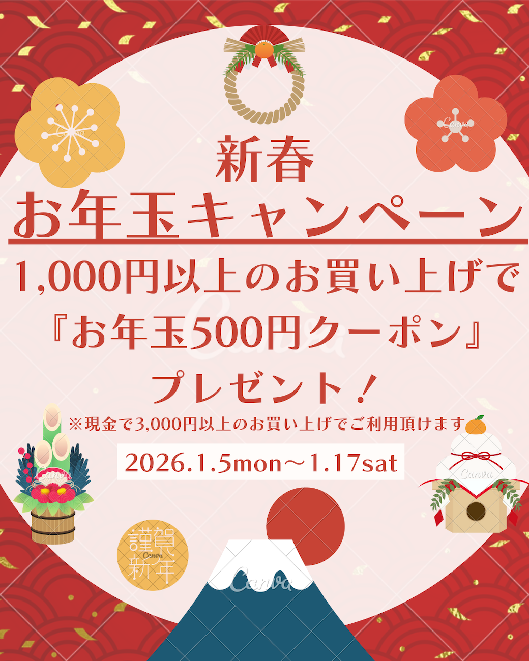 【新春お年玉キャンペーン】1月5日(月)から17日(土)まで、1,000円以上のお買い上げで『お年玉500円クーポン』をプレゼント致します!※クーポンは現金で3,000円以上のお買い上げでご利用頂けます。